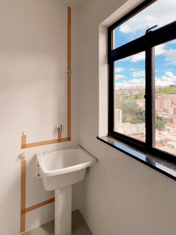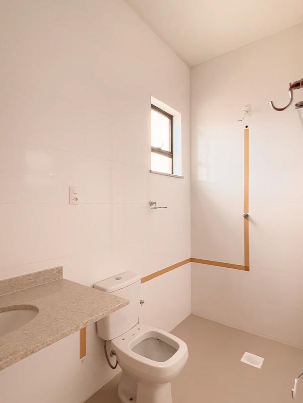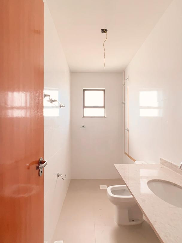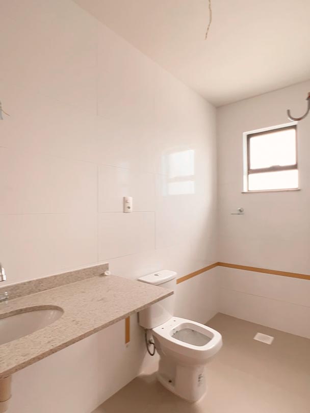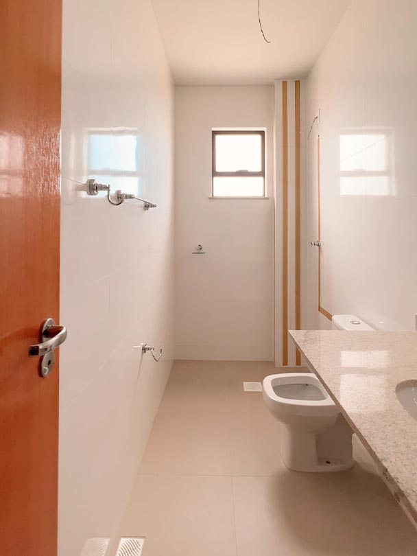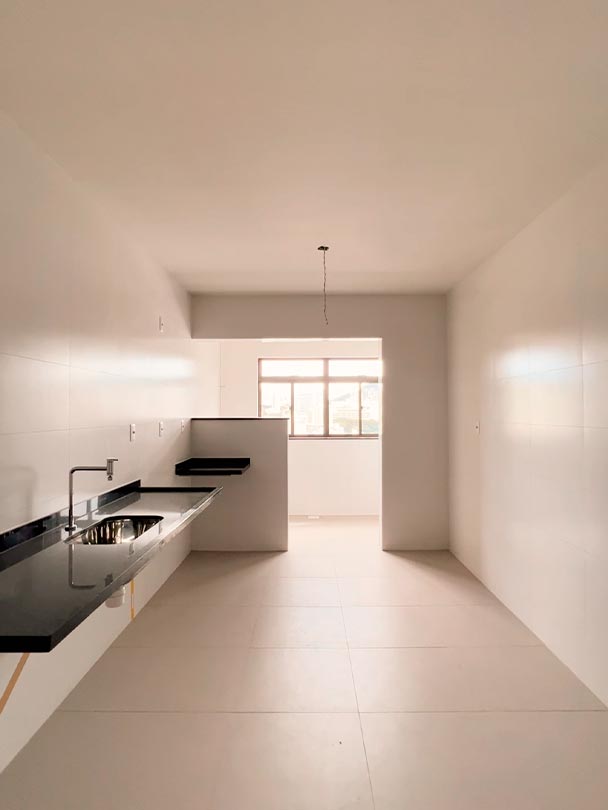 Cozinhas e banheiros azulejados em todas as paredes até o teto