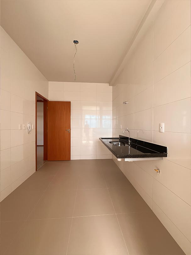 Cozinhas e banheiros azulejados em todas as paredes até o teto