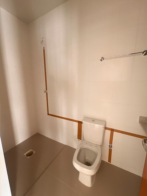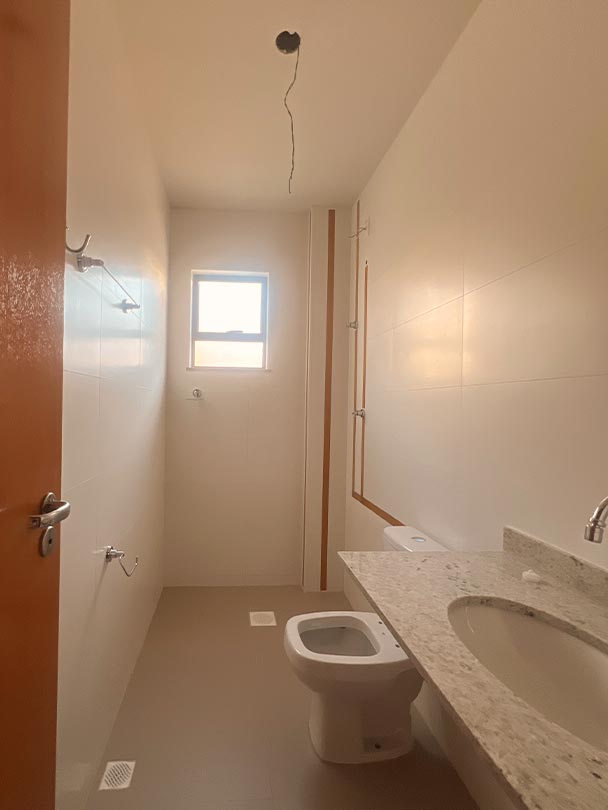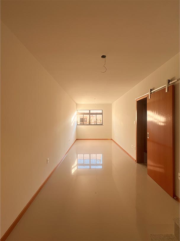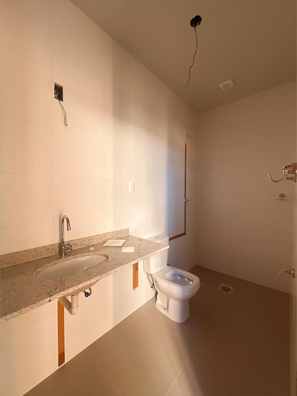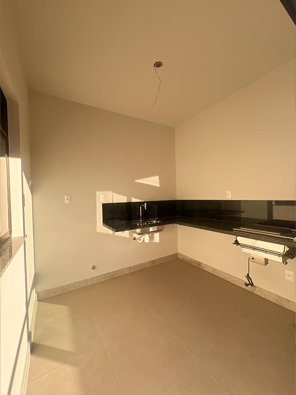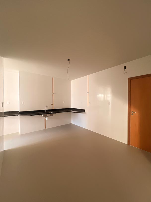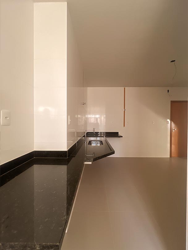 03 suítes, sala, cozinha, serviço, espaço gourmet, terraço de 10m² e uma vaga para dois carros.